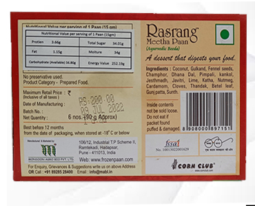 Being in Frozen Sweet corn industry over two decades and having the background of ethnic food, thus evolved “Rasrang Frozen Meetha Paan” which is a pure herbal product based on Ayurvedic ingredients. This Meetha Paan in “Frozen Vacuum Packed” form is introduced first time in India to the palates of Punekar’s, to begin with.